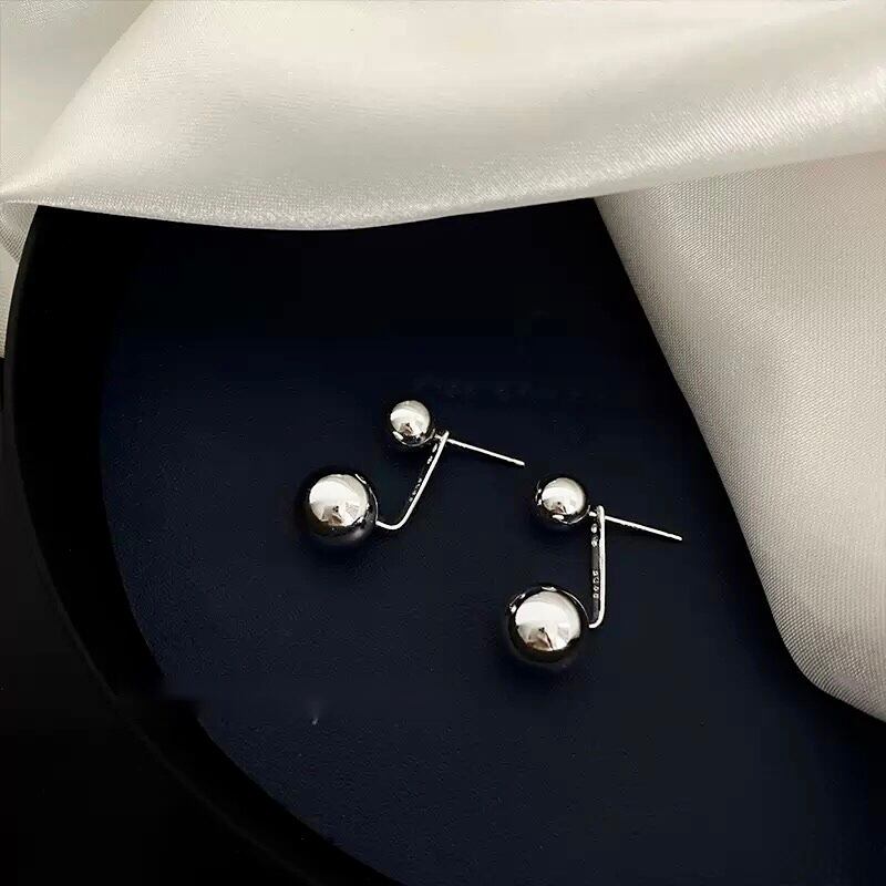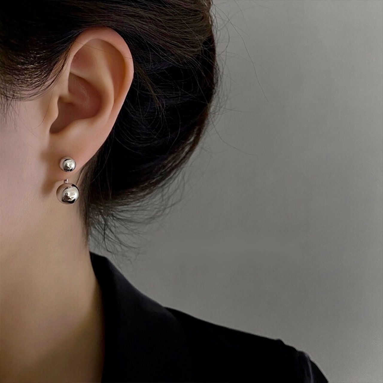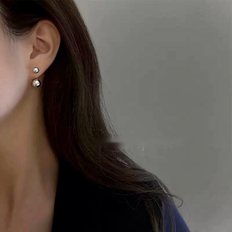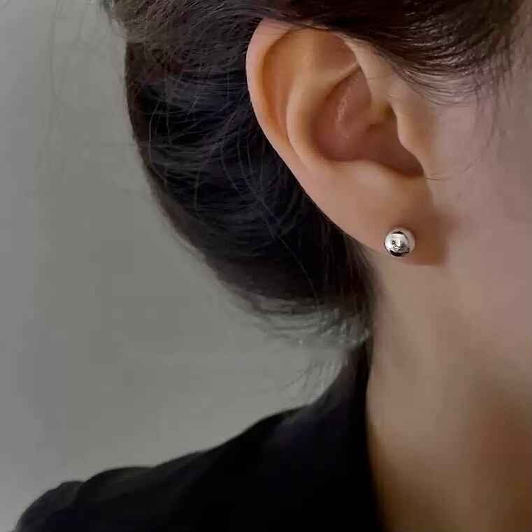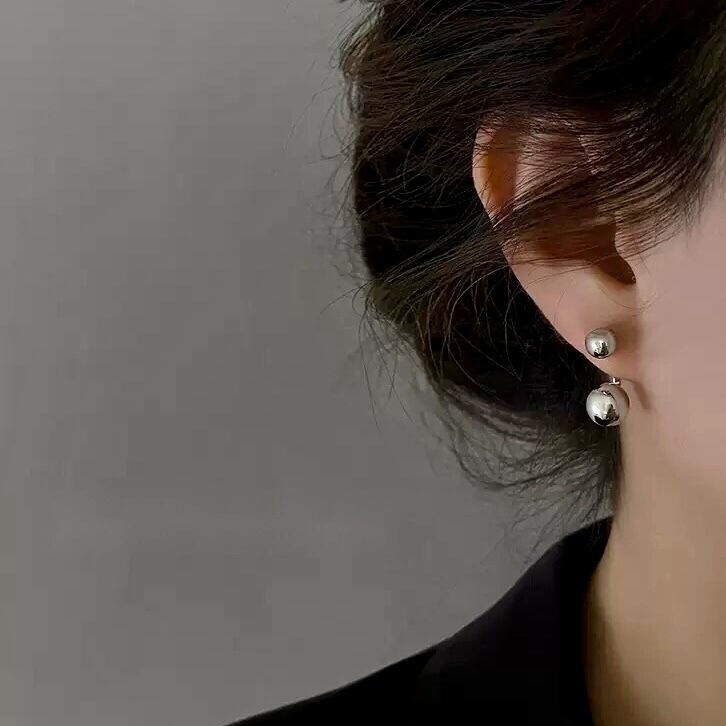 二つのボールで耳たぶを挟むデザインのシルバーピアス